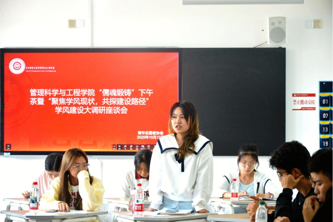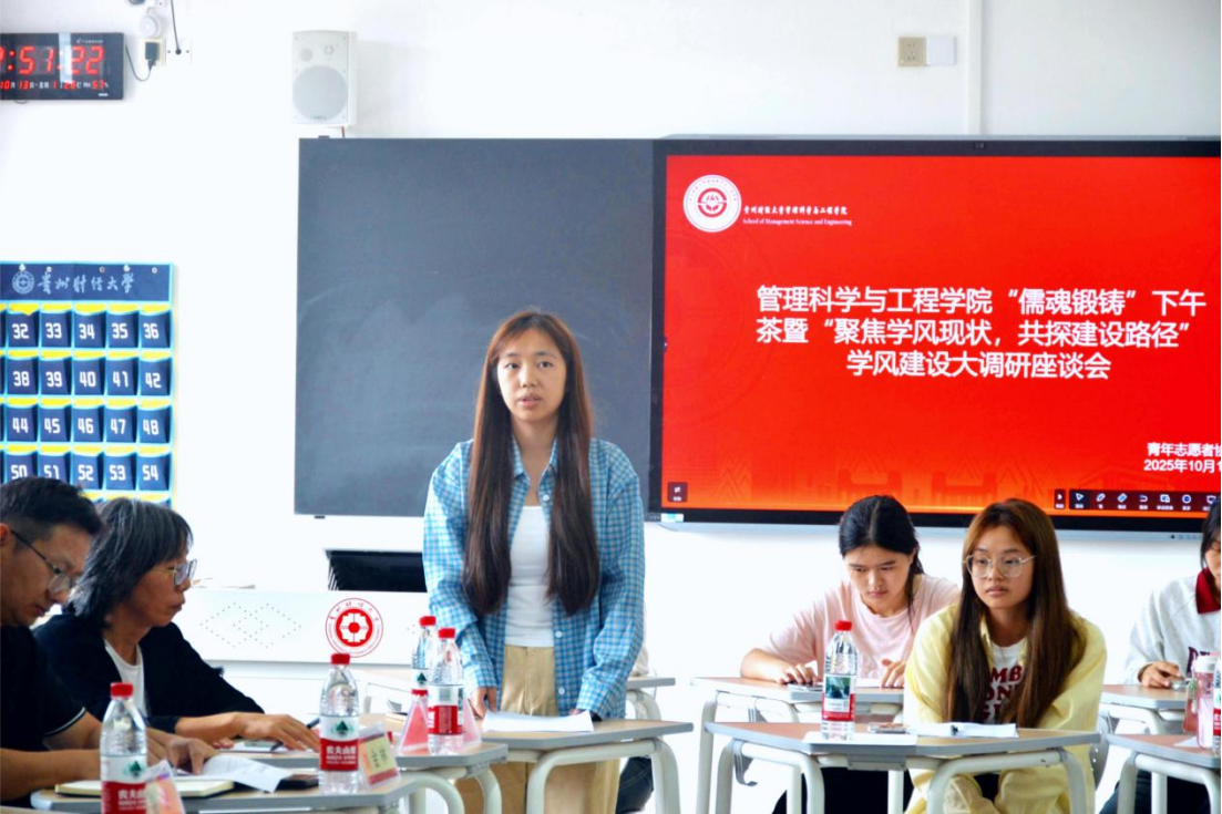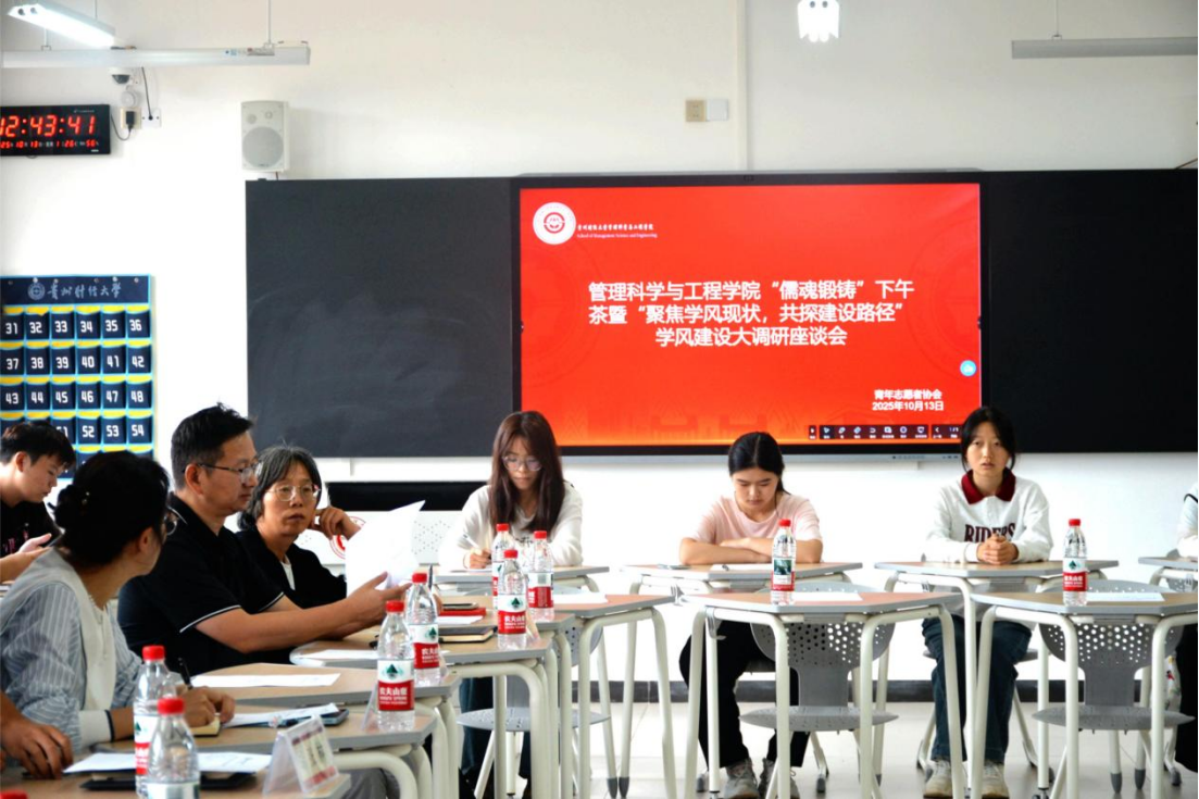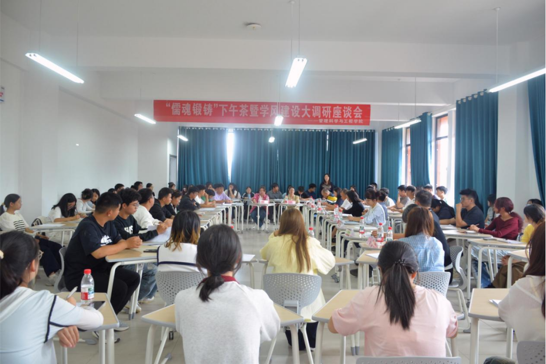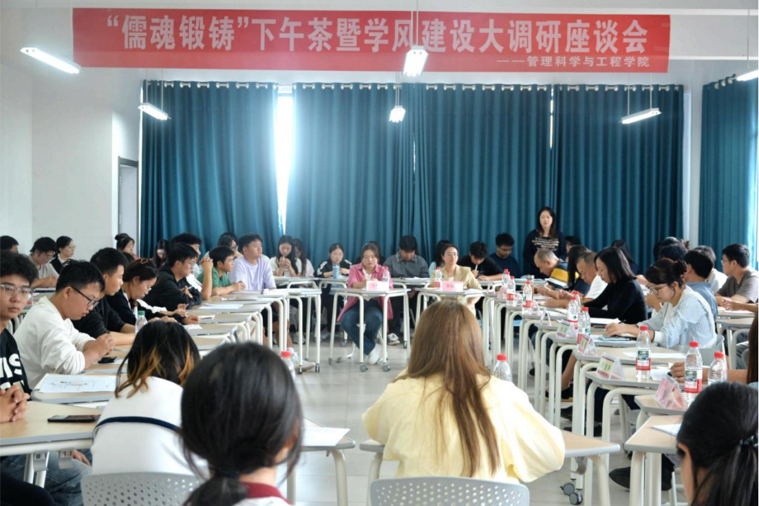 为精准把脉学风建设现状、凝聚育人合力,10月13日中午,402cc永利官网“儒魂锻铸”下午茶暨“聚焦学风现状,共探建设路径”学风建设调研座谈会在文溯楼4-1教室顺利举行。本次座谈会由学院党委副书记傅璟主持,特邀学院党委书记胡张林、党委副书记张颖、副院长梁龙、刘金林,各专业系主任及各科室老师、辅导员出席,与各班级班委及普通学生代表共同交流。